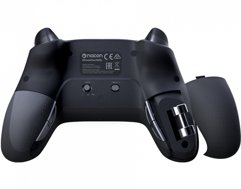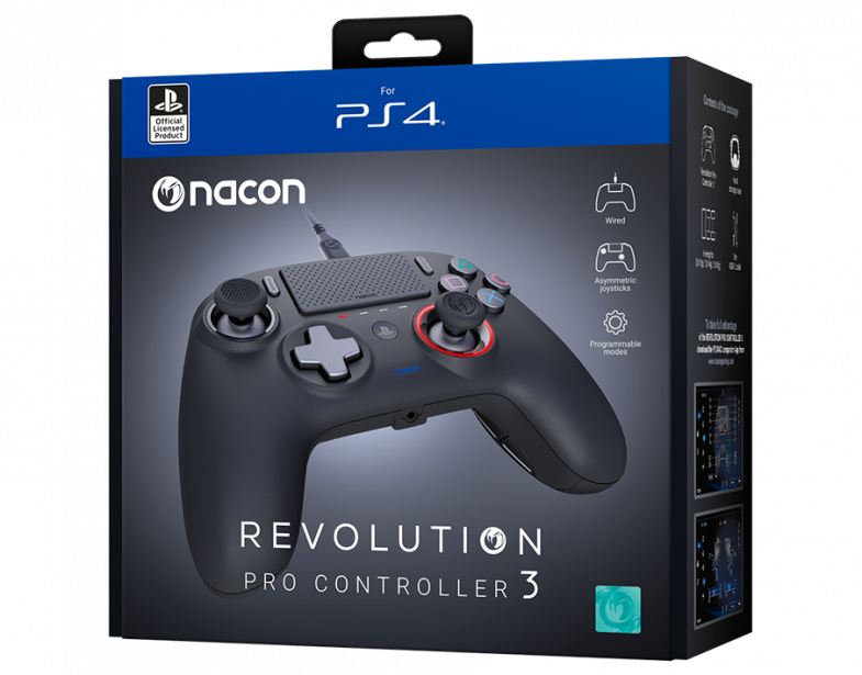 The REVOLUTION Pro Controller 3 is a wired controller created specifically for competitive gamers looking for performance and comfort. It boasts all the characteristic ergonomics of the REVOLUTION range: asymmetric sticks, larger action buttons and triggers, and two weight compartments for a truly personalized experience. Via the included PC* software interface, gamers can create custom game profiles: full button mapping, stick and trigger sensitivity, vibration motors and much more. With this wired controller, NACON has set the new standard for competitive gaming on PS4™. It is also fully compatible with PC games. You can dive right into the heart of the action in PS4™ mode, or level up faster with customised profiles in PS4™-Advanced or PC-Advanced mode!
