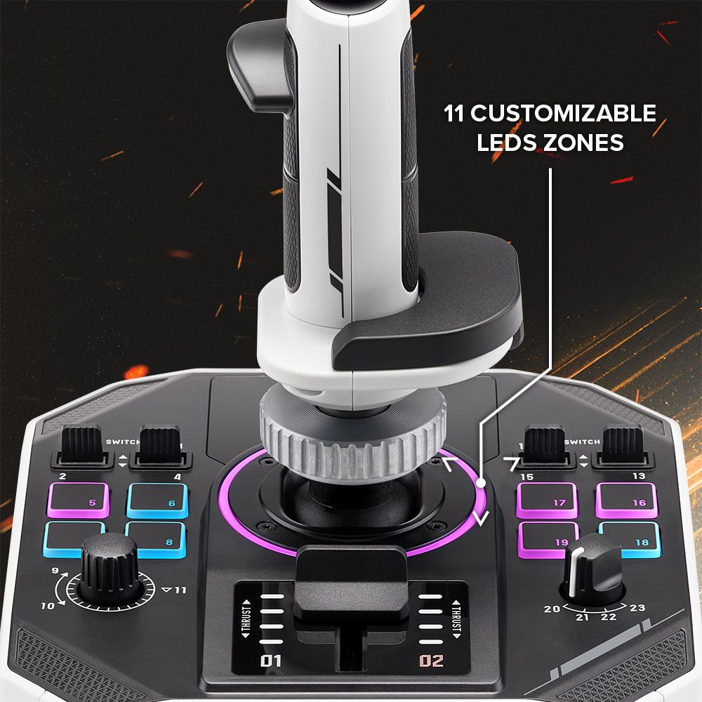 Doživi izvanrednu preciznost i potpunu odzivnost uz Thrustmaster SOL-R 1 Flightstick – vrhunski upravljač posebno dizajniran za svemirske simulacije i zračne borbe. Ovaj ergonomski oblikovan joystick s RGB osvjetljenjem i modularnim dizajnom omogućuje ti potpuno uranjanje u svjetove igara poput Elite Dangerous, Star Citizen ili Microsoft Flight Simulator. Ključne značajke: 44 programabilne funkcije: Ukupno 44 akcijske naredbe, uključujući 21 gumb na ručki (2 okidača, 2 “hat” prekidača, 1 mini ručica, 1 kotačić za palac) i dodatne kontrole na bazi. 3 fizičke osi + 5 virtualnih osi: X, Y i Z osi s 16-bitnom preciznošću zahvaljujući tehnologiji H.E.A.R.T. (HallEffect AccuRate Technology™), te dodatne virtualne osi za još bolju kontrolu. Dvoručni i udoban zahvat: Zamjenjive ergonomske potpore za palac i zapešće omogućuju prilagodbu za dešnjake i ljevake. Ikoničan dizajn s RGB osvjetljenjem: Nadahnut znanstveno-fantastičnim blockbusterima, joystick uključuje 11 softverski upravljanih RGB zona za potpuno iskustvo igre. Kompatibilnost s Thrustmaster ekosustavom: Odvojiva ručka kompatibilna je s AVA bazom, kao i s ručkama Viper, Hornet i budućim modelima. Podrška za T.A.R.G.E.T. softver: Napredni softver omogućuje testiranje, konfiguraciju i programiranje Thrustmaster kontrolera za potpunu prilagodbu tvojoj igri.