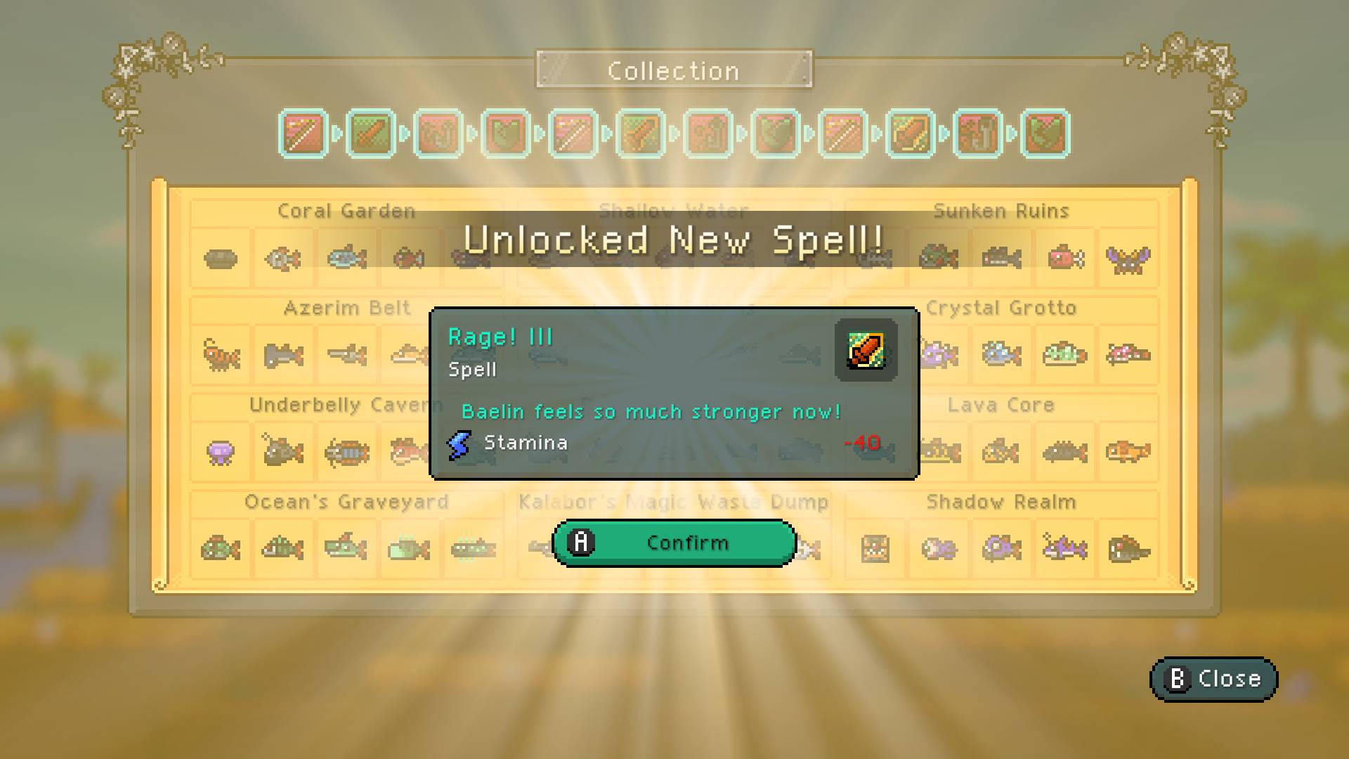 Svaki Pustolov zaslužuje najbolji alat za svoj zadatak. Iako je Baelin skroman ribar, kao Pustolov njegova je štap oružje, čamac mu je jahača zvijer, a šešir mu je oklop! Oprema je ključna – pomoću magnetne udice izvuci skrivena blaga iz dubina, a snažnim svrdlom probijaj zidove spilja kako bi otkrio nove prolaze. Nadogradi svoj štap za veću snagu i liniju za veće dubine te se suoči s izazovnim ribama koje vrebaju u sjenama.