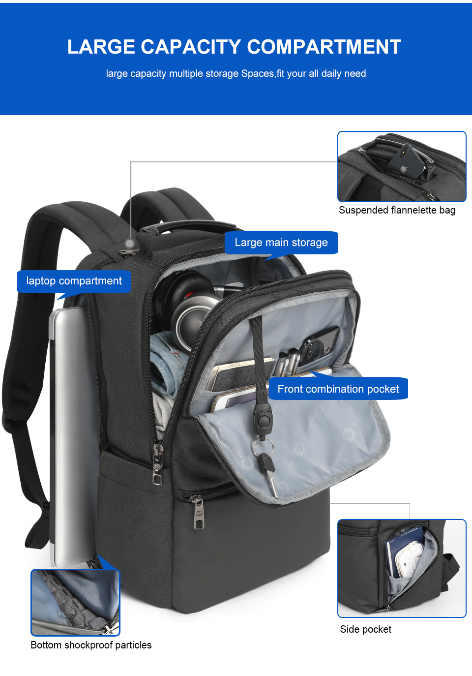 USB, RFID Protection, Dual Zip, Splash-Proof, Luggage Strap,Secret Pocket, Anti-Theft, Shoulder Strap Pocket, Zipper Sidepocket, Easy Laptop Access,